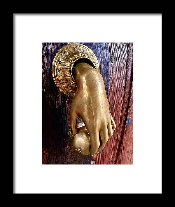 The image draws you into a close-up encounter with a truly stunning brass door knocker. Fashioned into the elegant shape of a human hand, it grips a decorative spherical element, poised to announce an arrival. The rich, golden hue of the brass gleams, its polished surface reflecting subtle light, highlighting the intricate details of the hand and the textured base from which it emerges. Every curve and line speaks of skilled metalwork, reflecting an era when even the most utilitarian objects were imbued with artistic flair.