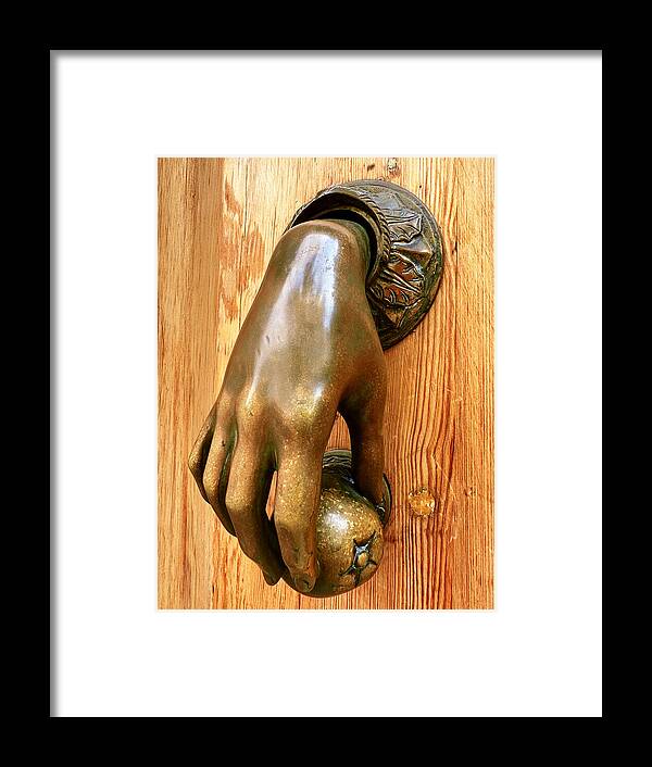 The image brings you into intimate proximity with a truly magnificent, historic door knocker. Fashioned from aged bronze, it takes the form of a detailed human hand, poised as if ready to tap. The hand gracefully cradles a beautifully rendered pomegranate, a fruit often symbolizing prosperity and fertility in Mediterranean cultures. Every curve and contour of the metalwork speaks of skilled craftsmanship and a bygone era when even utilitarian objects were imbued with artistic flair.