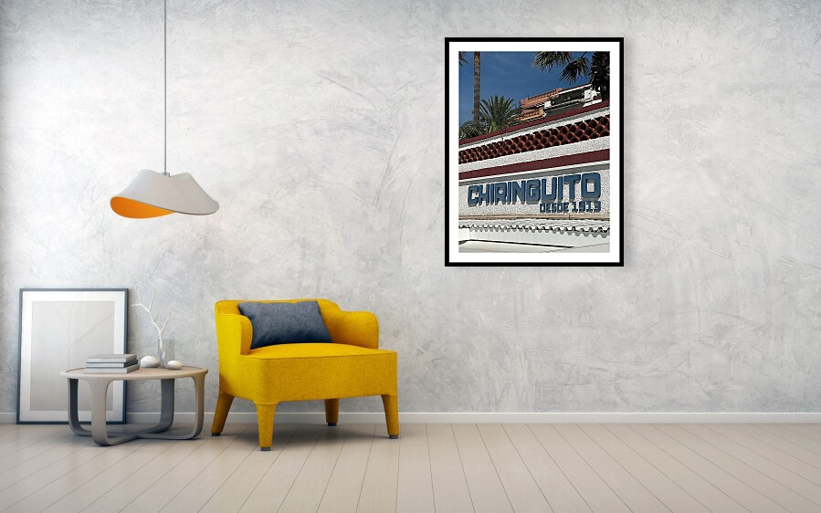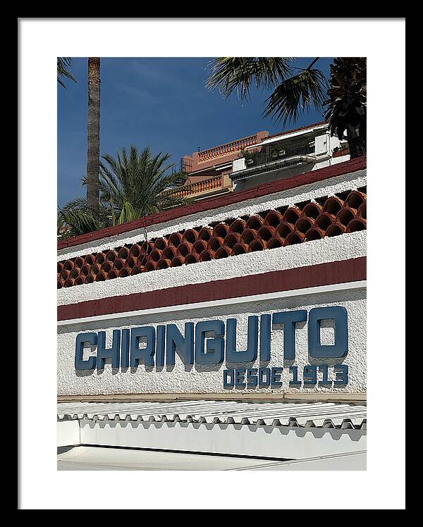 This close-up photo captures the sign for a classic Spanish beach bar, or “Chiringuito Desde 1913,” in Sitges. The image highlights the bold blue lettering on the white wall and the traditional terracotta half-pipe tile decoration above. This photograph speaks to the enduring coastal culture and historic charm of Sitges, celebrating its long-standing beachfront establishments. Outdoor sign with bold blue lettering displays ‘Chiringuito Desde 1913’. Surrounded by palm trees, indicating a sunny coastal area.