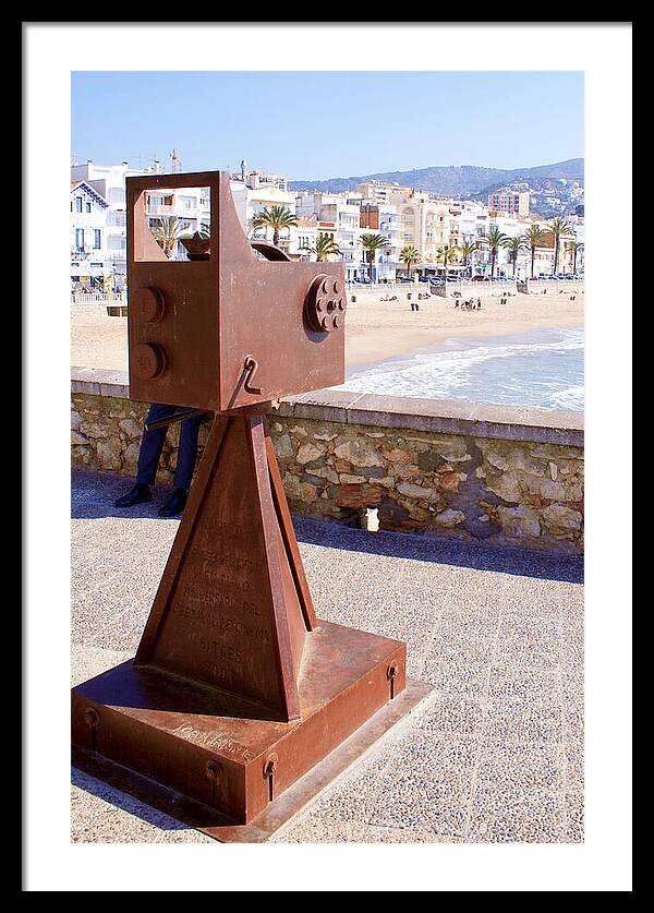 Sitges, a picturesque gem on the Catalan coast, is celebrated not only for its stunning beaches and charming streets but also for its vibrant cultural scene, especially its world-renowned Sitges International Film Festival of Catalonia. This photograph perfectly encapsulates that unique blend, showcasing a striking monument dedicated to the art of cinema, set against the backdrop of the beautiful Mediterranean.