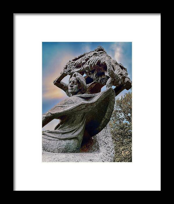 The dramatic monument to Frédéric Chopin in Warsaw’s Łazienki Park is captured in bronze against a surreal sky. This powerful sculpture by Wacław Szymanowski embodies the sweeping emotion of Chopin’s music, blending Romanticism with nature and national memory in a truly iconic Polish landmark. A monumental sculpture depicts an expressive figure draped in flowing garments and supporting a large, intricate form. Set against a colorful sky, the artwork conveys movement and drama.