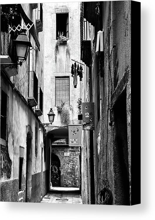 In the labyrinthine heart of Barcelona’s Gothic Quarter (Barri Gòtic), every narrow alleyway holds a story, and some reveal a dramatic sense of scale that takes your breath away. This striking black and white photograph captures just such a scene, drawing the viewer into a world where ancient architecture towers overhead.