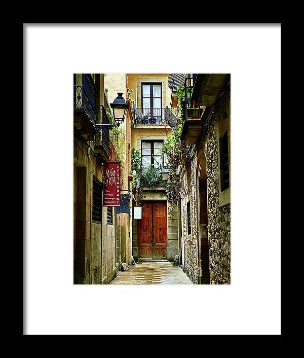Step into a moment of pure urban charm in Barcelona’s Gothic Quarter. This photograph captures an intimate street scene, where ancient stone and rustic textures tell a story of centuries past. The narrow alleyway, with its worn cobblestones and tall buildings, is a feast for the eyes, adorned with lush plants spilling from balconies and a beautiful, rustic wooden door at its center. The glowing streetlamp and hanging restaurant sign add to the authentic, lived-in atmosphere, inviting you to imagine the conversations and footsteps that have passed through this very spot. This photograph is now available to purchase as a print in many formats, including Fine Art Print, Canvas Print, Framed Print, Art Print, Poster, Metal Print, Acrylic Print, Wood Print, and Greeting Card.