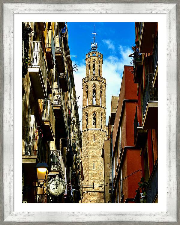 This striking photo captures a powerful perspective of the Basílica de Santa Maria del Mar’s towering spire, beautifully framed by the narrow, historic buildings of Barcelona’s Gothic Quarter. The image highlights the grand gothic architecture of the church and the intimate details of the surrounding street, including a classic street lamp with a clock and the rustic balconies. It’s a unique view that showcases the blend of monumental landmarks and the charming, lived-in character of the city.