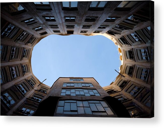Looking upward from an interior courtyard, the sky creates an ellipsoidal opening framed by the surrounding architecture. The buildings encase the view in a mixture of shaded facades with numerous windows, contrasting with the bright blue sky above.