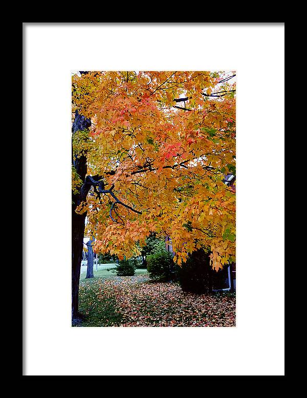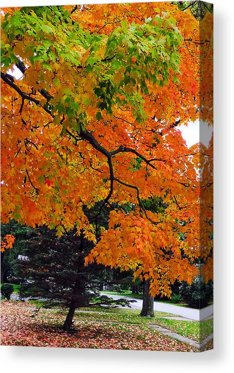 A vibrant maple tree is ablaze with autumn hues, ranging from deep orange to golden yellow. Fallen leaves carpet the ground beneath it, suggesting a crisp, fall scene.