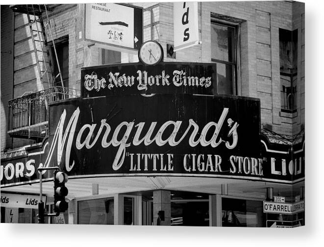 A black and white photo captures the vintage signage of Marguard’s Little Cigar Store with “The New York Times” sign perched above it. The streetscape includes other commercial signs and a street clock, indicating a busy urban setting.