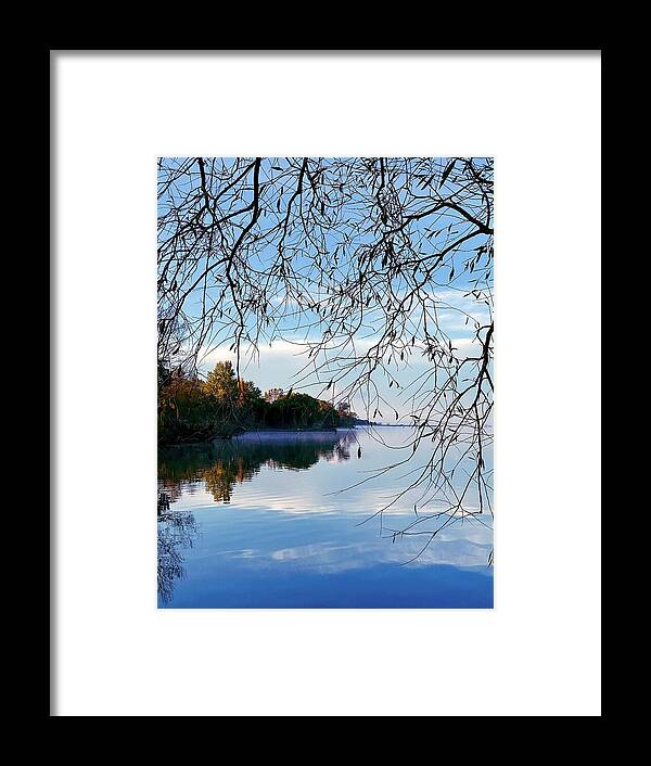 Bare branches frame a tranquil lake scene, where the calm waters reflect the sky and distant treeline. The serenity of the scene is enhanced by the soft colors of dawn or dusk, providing a sense of peace and solitude.