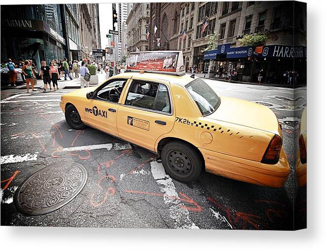A yellow taxicab is turning on a bustling city street with markings and utility covers on the asphalt. Pedestrians can be seen in the background, possibly crossing the street or waiting, and there are various storefronts along the sidewalk.