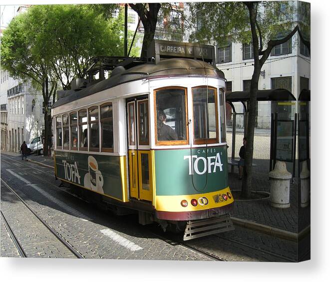 A vintage tram with advertisements for Cafés Tofa is navigating a street lined with trees and traditional cobbled pavement. A driver is visible through the window, and a couple of pedestrians can be seen in the background.