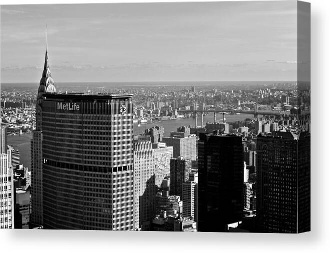 A collection of high-rise buildings dominates the foreground, with the prominent MetLife Building center stage, while the background features an expanse of densely packed urban development and a river. The cityscape is captured in monochrome, which accentuates the play of light and shadows across the various architectural forms and textures.