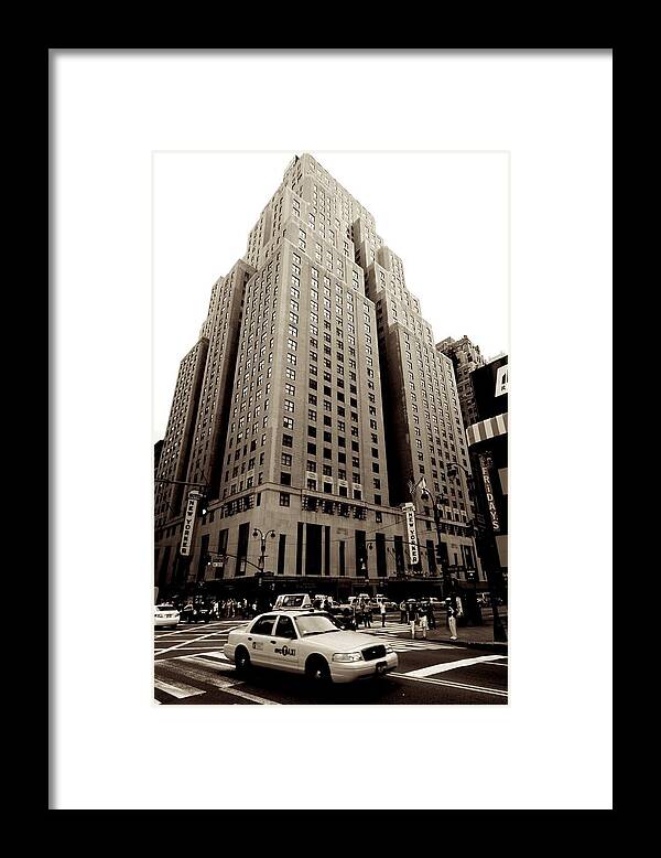 A towering building looms large in the frame, capturing the essence of urban architecture with its numerous windows and tiered structure. In the foreground, a taxi cab is prominently positioned on the street, hinting at the bustling city life.
