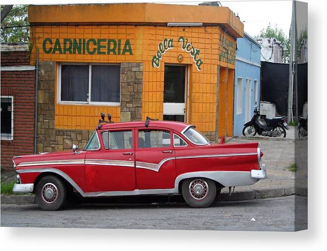 A vintage red and white car is parked in front of a building with the words “CARNICERIA bella vista” painted over its entrance. The building sports a two-tone yellow and orange facade, contrasting with the vibrant vehicle.