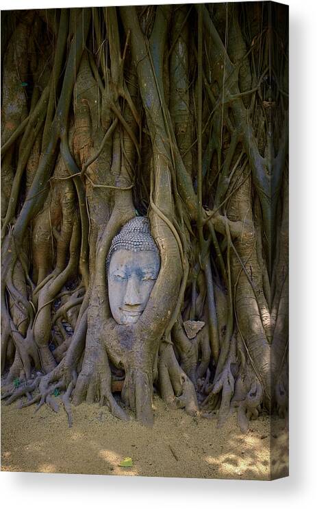 A stone Buddha head is nestled within the entangled roots of a banyan tree, creating a serene yet striking scene. The roots appear to have grown around the sculpture over time, perfectly framing it and highlighting its peaceful expression.