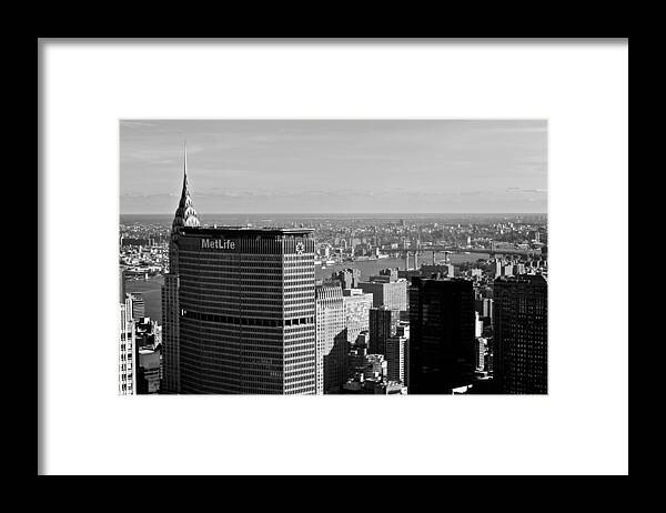 A collection of high-rise buildings dominates the foreground, with the prominent MetLife Building center stage, while the background features an expanse of densely packed urban development and a river. The cityscape is captured in monochrome, which accentuates the play of light and shadows across the various architectural forms and textures.