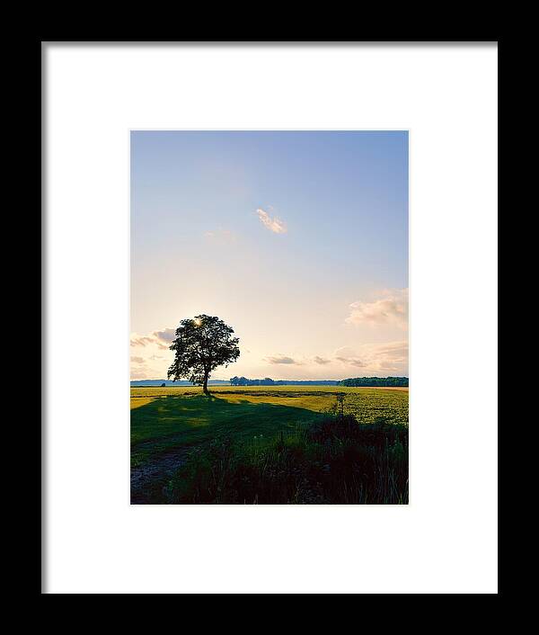 A lone tree stands in the middle of a field with the sun peeking through its branches during a serene sunset. The sky is adorned with soft clouds and bathes the landscape in a warm, golden light, casting elongated shadows across the grass.