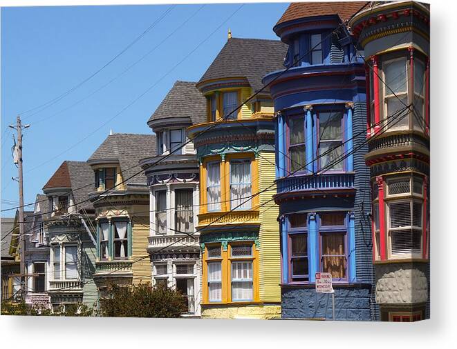 Victorian-style houses, also known as Painted Ladies, line up along a street, showcasing their distinctive architectural features and colourful facades. These classic structures are adorned with ornate detailing and are typical in certain historic neighbourhoods.