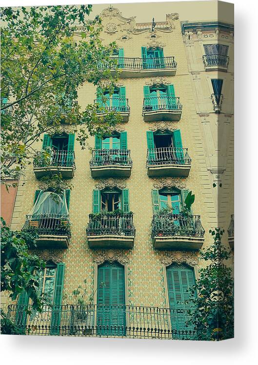 Barcelona’s Teal Shutters and Balconies Surrounded by Greenery on a Multi-Story Building Canvas Print