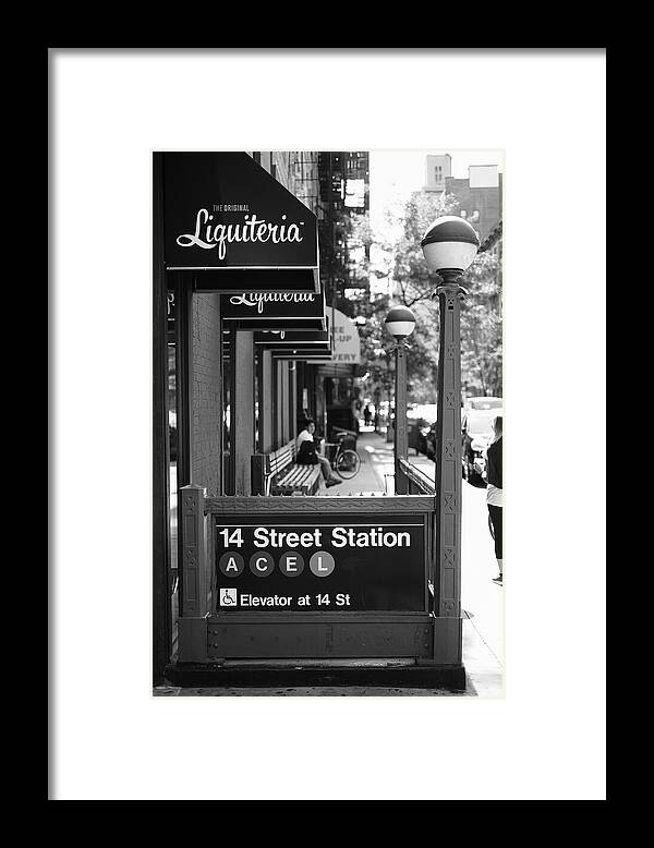A black and white photo captures the entrance to the 14 Street Station serving the A, C, E, and L lines in New York with the sign indicating an elevator at 14 St. Above the subway entrance, the sign for ‘The Original Liquiteria’ can be seen, hinting at the bustling urban environment.