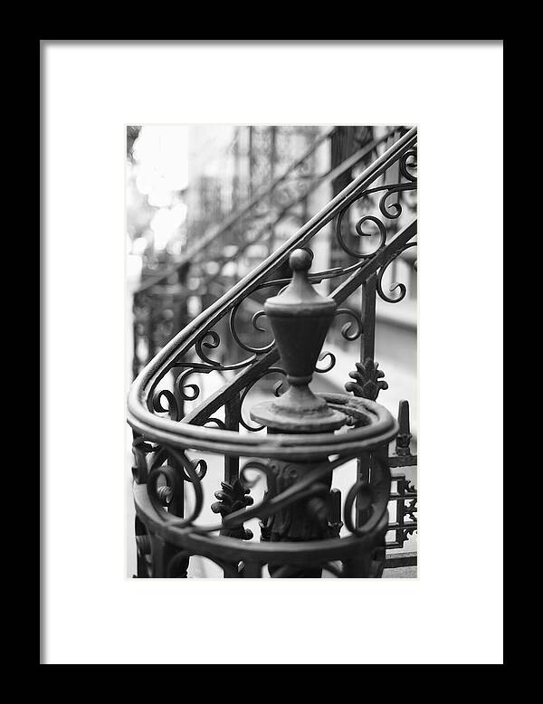 A black and white photograph focuses on an ornate wrought iron railing with elegant swirls and a patterned design. The depth of field is shallow, emphasizing the details of the railing and creating a blurred background that hints at a residential setting in New York City.