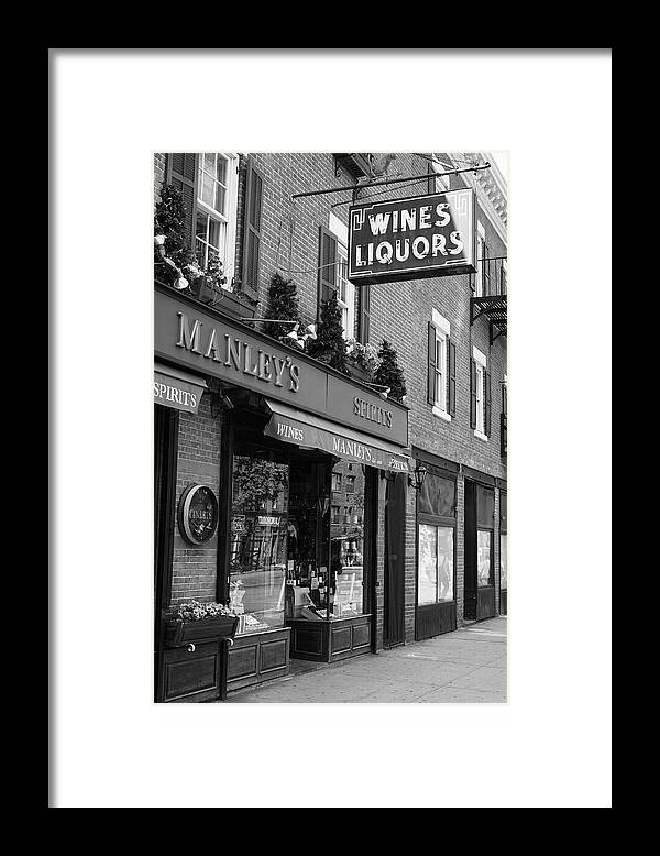 A black and white photo captures a street view of a liquor store with a prominent “Wines & Liquors” sign hanging above. The store, named “Manley’s,” displays various spirits and wines in its window, inviting passersby to take a closer look at its selection.