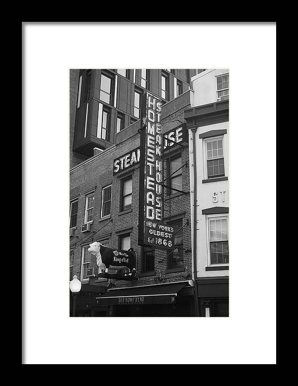 A black and white photo captures the vertical sign of the Old Homestead Steakhouse, proclaiming it as New York’s Oldest, established in 1868. A model of a cow adorned with a banner hangs above the entrance, adding a whimsical touch to the establishment’s facade.