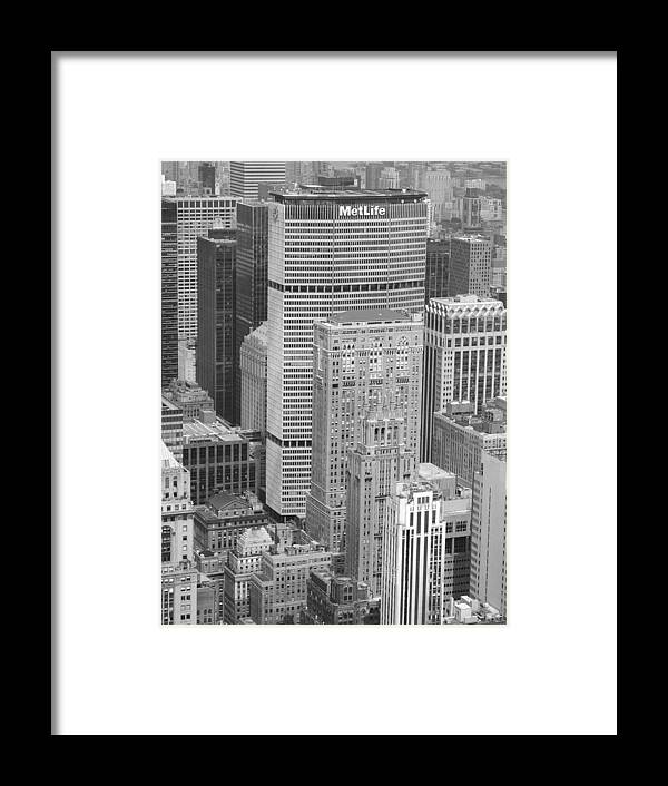A dense cluster of high-rise buildings, including MetLife dominates the view, prominently featuring the MetLife Building in the center. The monotone color palette suggests a black and white photograph, highlighting the architectural details and textures of the urban landscape.