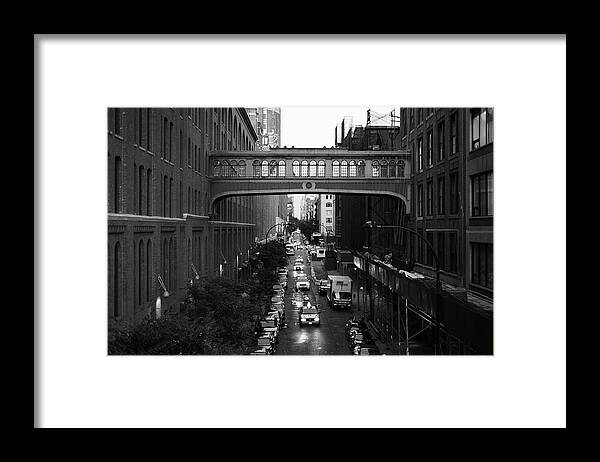 A monochrome photo captures the dynamic streetscape of a city with cars lined up on either side of the road. An elevated pedestrian bridge spans between two large buildings, creating an urban tunnel over the bustling street below in New York City.