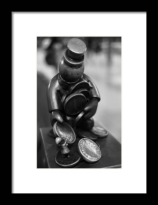 A monochrome photograph captures a small metal sculpture portraying a stout figure with circular elements and oversized coins, possibly as a caricature of economic themes. The sculpture features exaggerated representations of money and is set against a blurred background, emphasizing its details and textures.