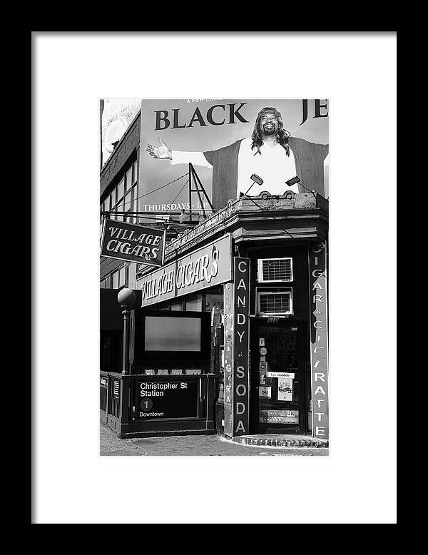 A black and white photograph captures the street corner view of Village Cigars, a small store situated below a large billboard advertising a comedy show titled “Black Jesus.” The shop showcases various signs for cigars, candy, and soda, and it is adjacent to the entrance of the Christopher St Station subway.