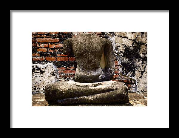 A headless stone statue sits against a backdrop of a weathered brick wall, exuding an air of historical significance and abandonment. The statue, missing its head and arms, yet the torso and crossed leg position are clear, suggesting a former pose of meditation or reflection.
