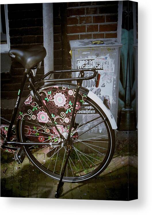 A bicycle with a floral-patterned frame stands against a brick wall, near a door covered in a variety of stickers and graffiti. The bike appears to have a vintage design, featuring a black seat and white wheel fenders, adding contrast to the vibrant frame design.