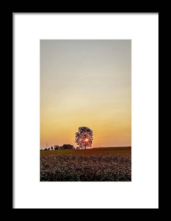 A lone tree stands prominently in a crop field with the setting sun directly behind it, creating a picturesque silhouette. The sky is adorned with gradient hues of orange and blue, while a wind turbine can be faintly seen in the background.