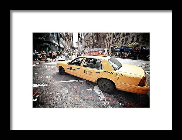 A yellow taxicab is turning on a bustling city street with markings and utility covers on the asphalt. Pedestrians can be seen in the background, possibly crossing the street or waiting, and there are various storefronts along the sidewalk.