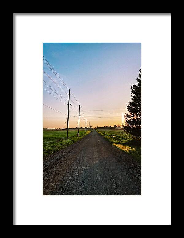 A dirt road stretches into the distance flanked by power lines and green fields under a dusk sky. The setting sun casts a warm glow over the scenery, creating a tranquil rural setting.