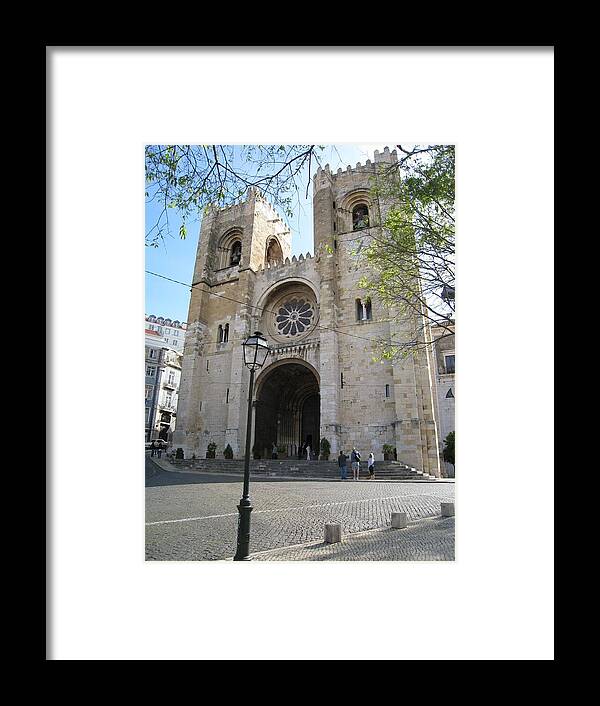 A large cathedral with twin bell towers and an intricate rose window dominates the view, with visitors approaching its arched entrance. Streets and buildings indicative of a European city surround the cathedral, and a lamppost stands prominently in the foreground.