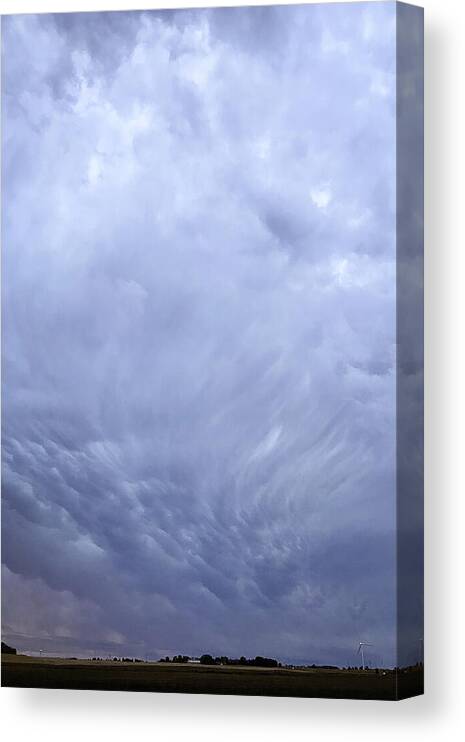 A dramatic sky filled with tumultuous clouds dominates the view, suggesting an impending storm. Below, a strip of land with sparse structures provides a stark contrast to the brooding atmosphere above.