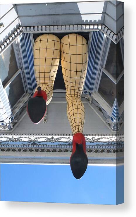 A pair of oversized, fishnet-clad legs dangle upside down from the roof of a building, ending in high-heeled shoes. They appear almost as if someone giant is walking on the sky, adding a surreal touch to the otherwise ordinary facade.