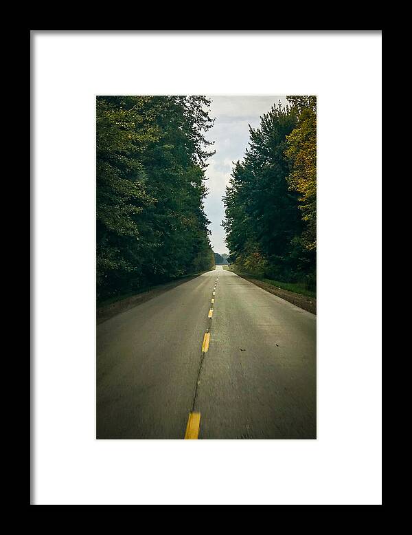 A two-lane road stretches into the distance, flanked by dense trees on both sides. The overcast sky suggests a gloomy or damp atmosphere, enhancing the sense of a solitary journey through the woods.
